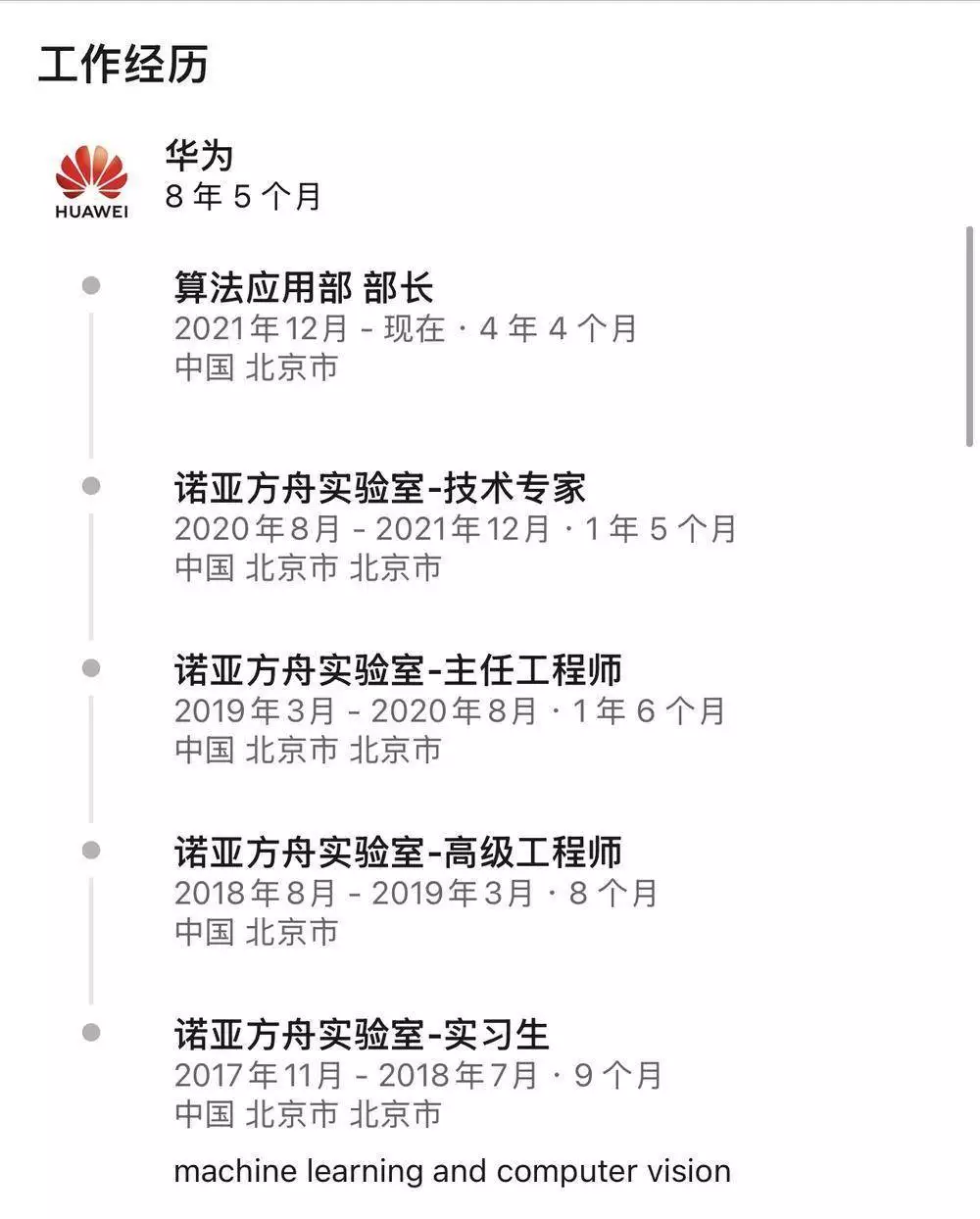 自2017年11月,他便进入华为诺亚方舟实验室实习,此后一直在华为发展,先后经历高级工程师、主任工程师、技术专家等岗位,并于2021年12月起担任算法应用部部长。2025年3月,在原诺亚方舟实验室主任姚骏内部调岗后,王云鹤接任诺亚方舟实验室主任,并成为盘古大模型负责人,至今约一年。