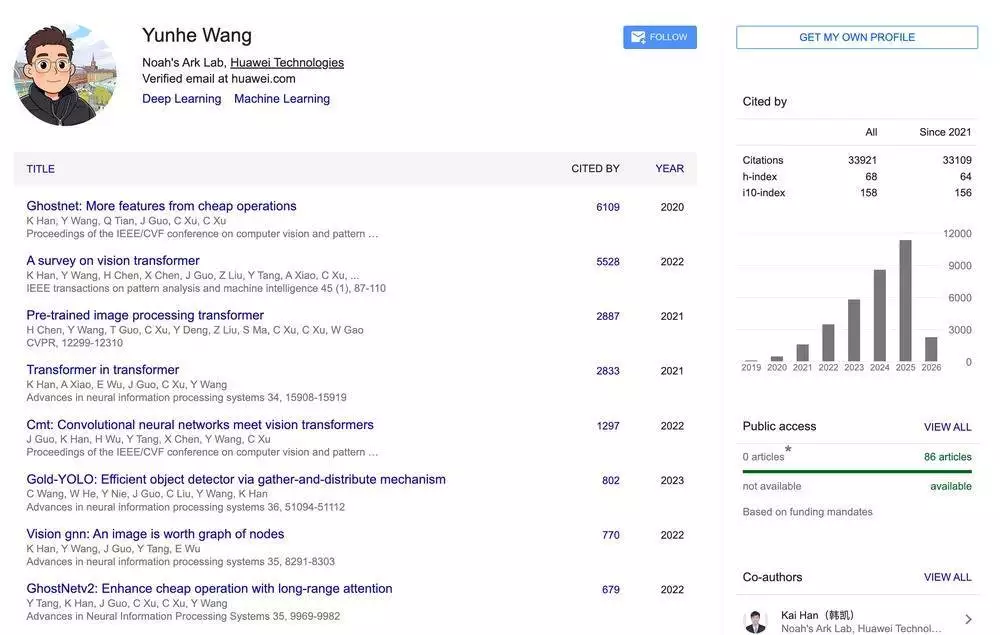 其代表性论文包括CVPR 2020的《GhostNet: More features from cheap operations(GhostNet:用更低成本计算获取更多特征)》(GhostNet:用更低成本计算获取更多特征),引用超过6000次,以及TPAMI 2022的《A survey on vision transformer(视觉Transformer综述)》(视觉Transformer综述),引用超过5000次。