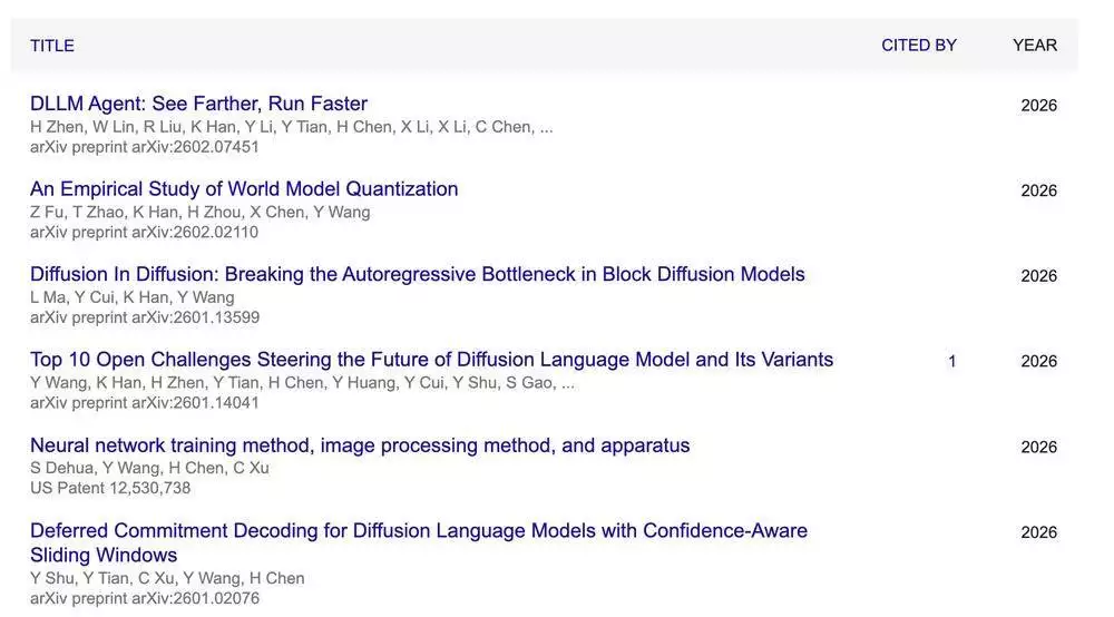 从最新研究来看,王云鹤在2026年仍持续发表论文,共计6篇,其中包括《DLLM Agent: See Farther, Run Faster》,探索基于扩散模型的LLM Agent框架,以及《An Empirical Study of World Model Quantization》《Diffusion in Diffusion》等文章,其研究已延伸至Agent多步决策等方向。
